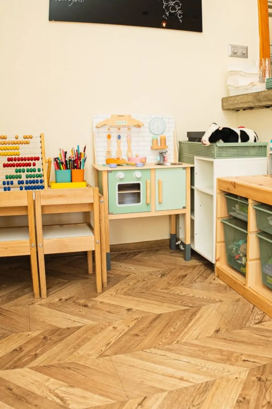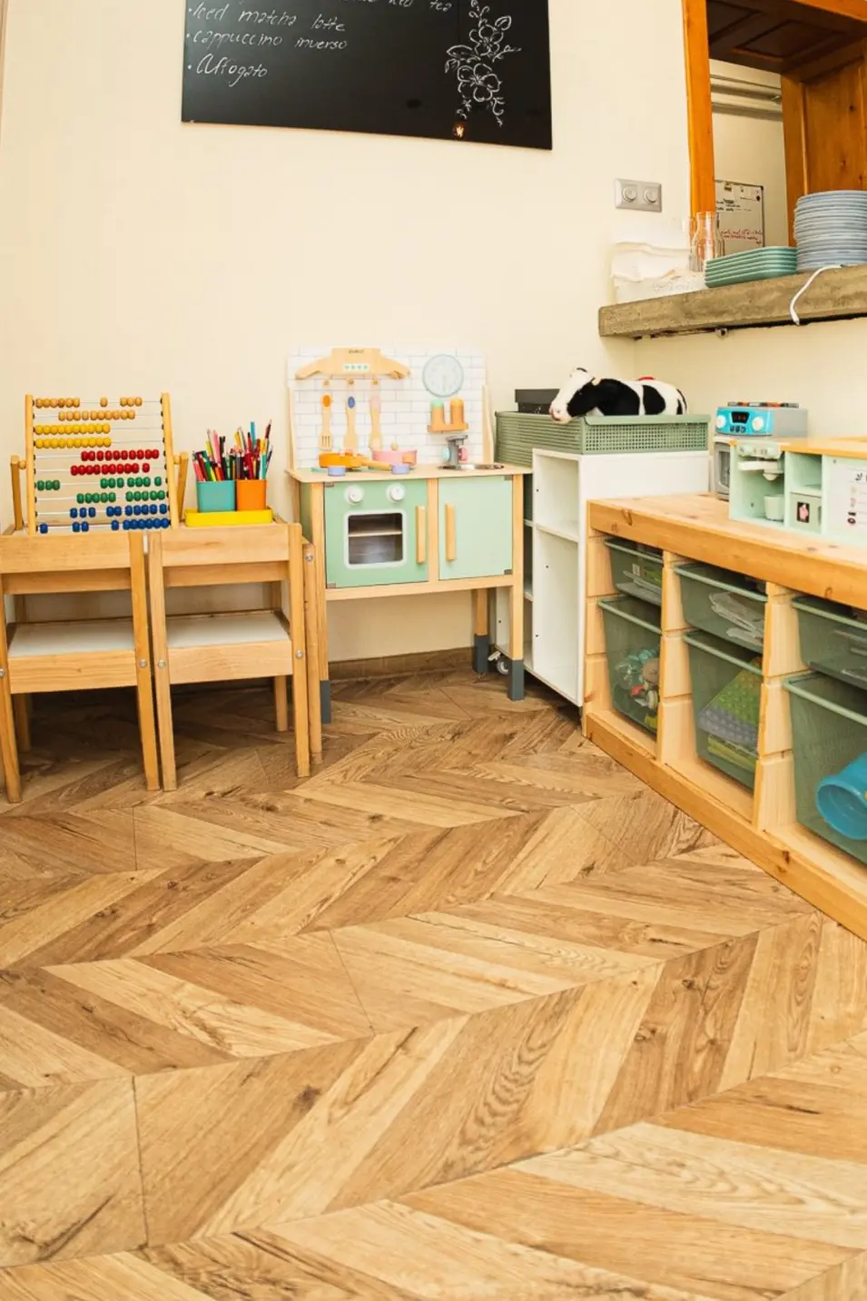 Kútik je zariadený s dôrazom na kvalitu, jednoduchosť a estetiku, aby prirodzene zapadol do celkového dizajnu historického priestoru. Nájdete tu drevené hračky, kreatívne prvky aj malé „domáce“ prostredie, ktoré podporuje detskú fantáziu a tvorivosť.